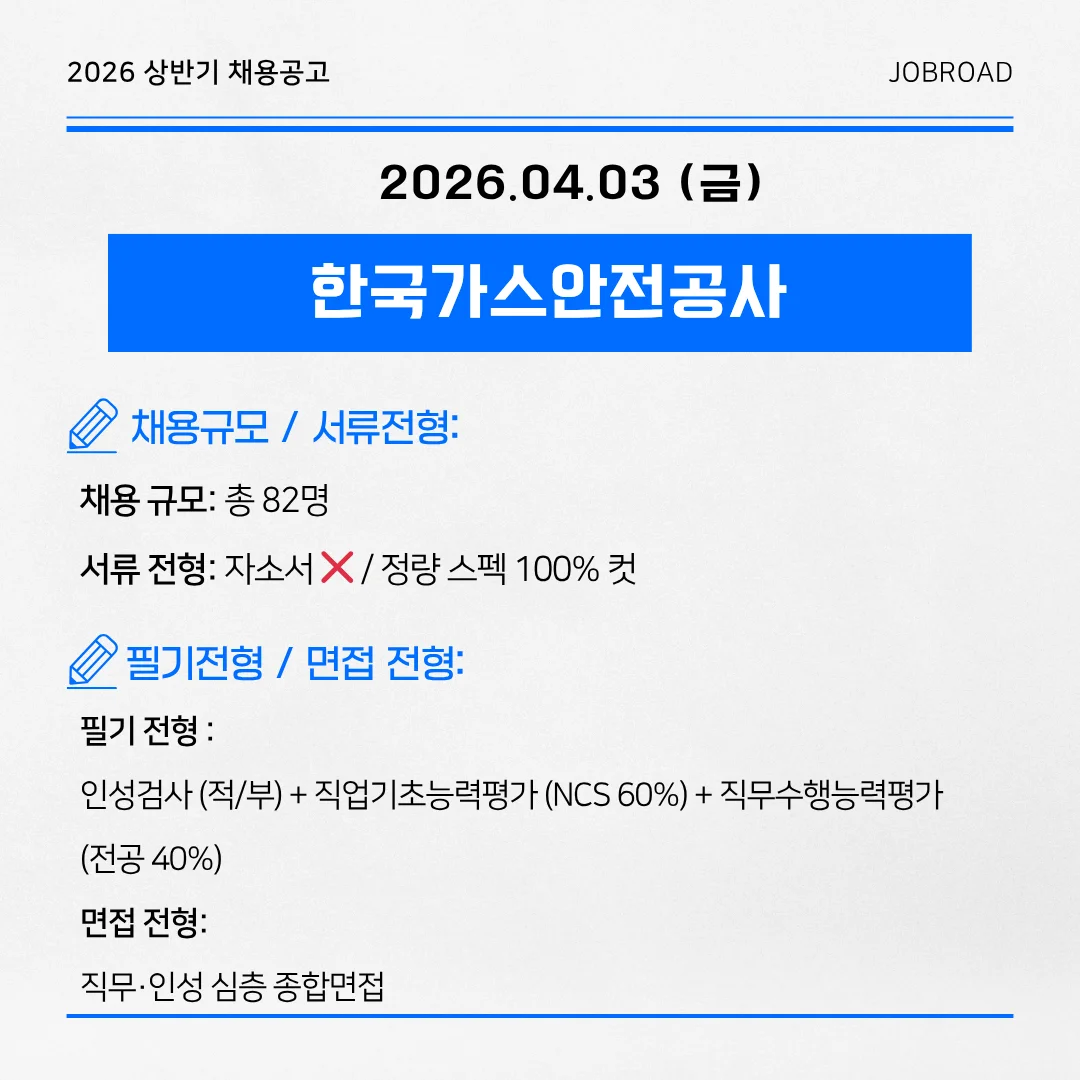 2026년 상반기 공기업 채용 완벽 분석! 서류 전형 적부(도로공사), 자소서 면제(가스안전공사, 한전), 전공 필기 핵심(국민연금) 등 취준생이 반드시 알아야 할 주요 4대 공기업의 전형별 합격 전략과 스펙 커트라인을 낱낱이 파헤쳐 드립니다.