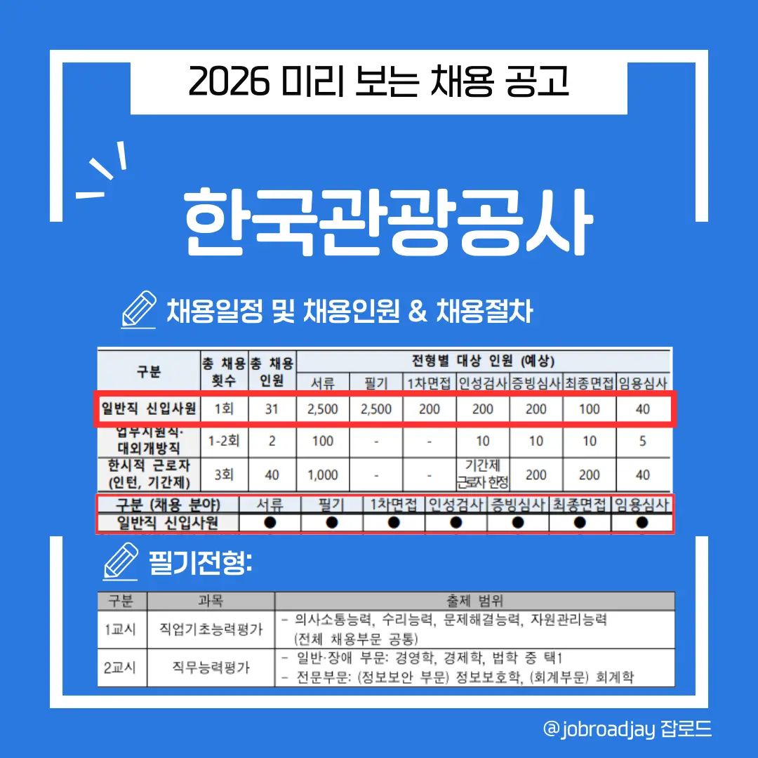 💡 Tip: 31명이면 TO가 많지 않습니다. 하지만 관광공사는 '서류 적부'라는 엄청난 기회를 줍니다. 스펙이 조금 부족해도 필기 실력만 있으면 뒤집을 수 있다는 뜻이죠!